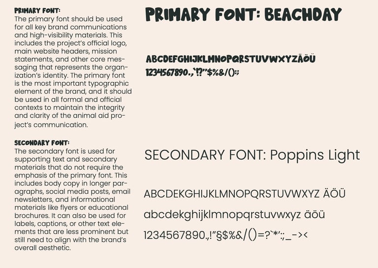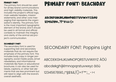 The primary font, Beachday, is used for all key communications, including the official logo, website headers, and mission statements. This ensures that core messaging is clear, consistent, and immediately recognizable. The secondary font, Poppins Light, is applied to supporting text and materials, such as body copy, newsletters, social media posts, and educational brochures, providing a clean, readable complement to the primary font.