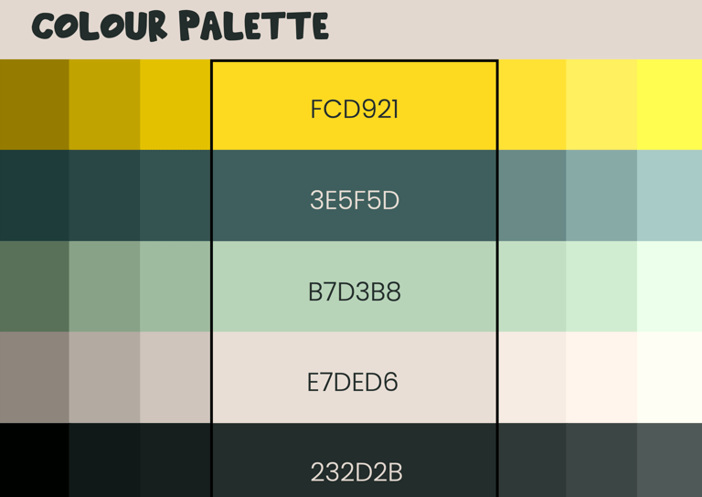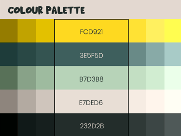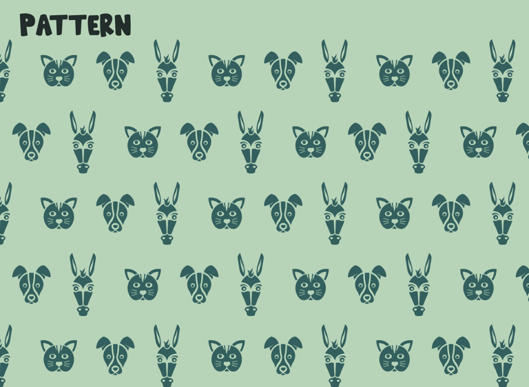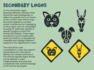 The color palette combines a bright yellow, inspired by the warning sign of the NGO’s main sponsor, with forest green, light sage green, beige, and a very dark, almost black green. The greens and neutrals evoke a natural, earthy feel, while the yellow adds energy, attention, and ties back to the sponsor’s identity. The warning sign also features a dog illustration, subtly integrating the organization’s core focus on animal care into the visual identity.