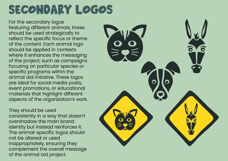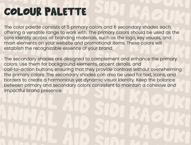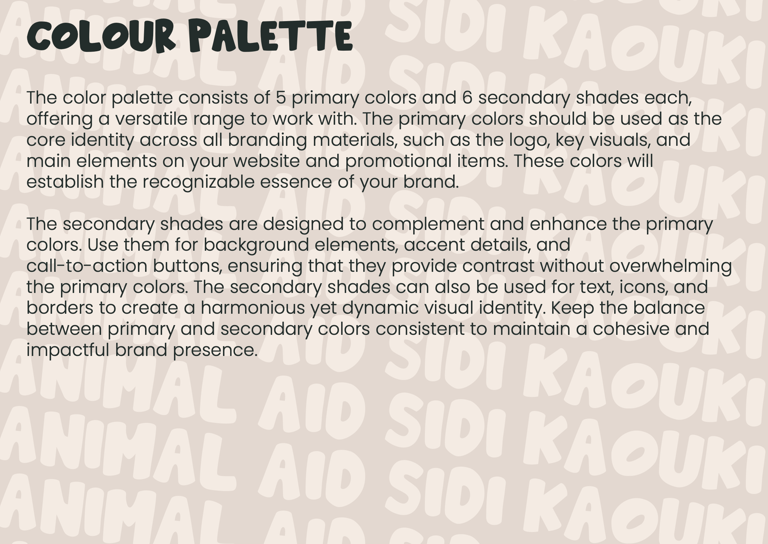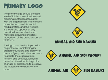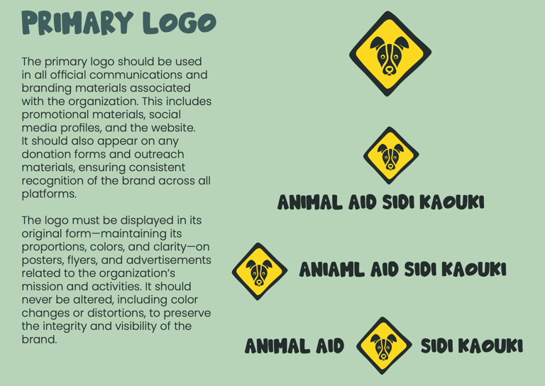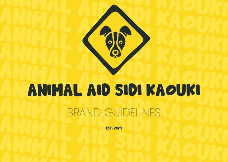 Together, the fonts, colors, and iconography create a distinctive, approachable, and professional identity for Animal Aid Sidi Kaouki, supporting its mission to protect and find homes for animals in need.