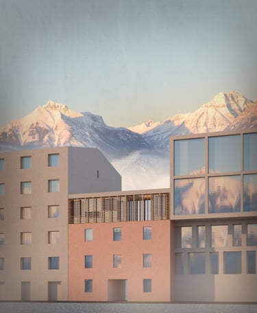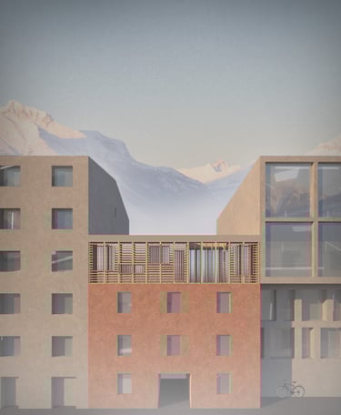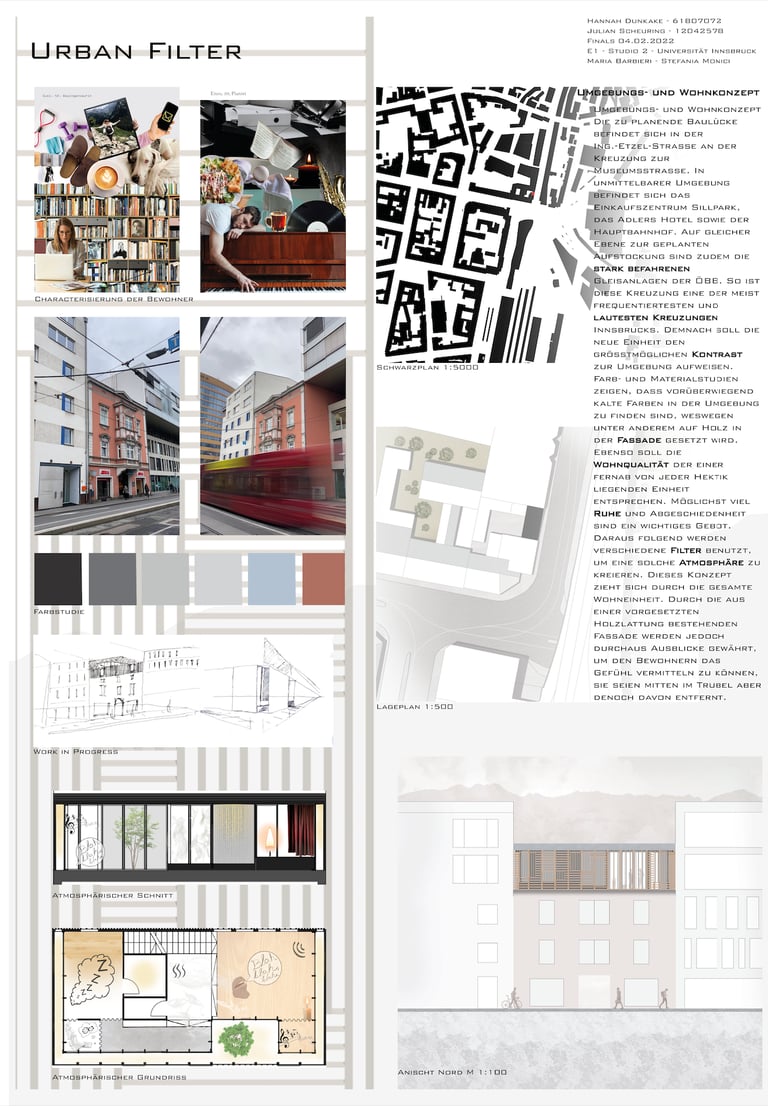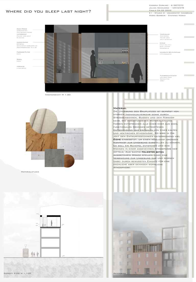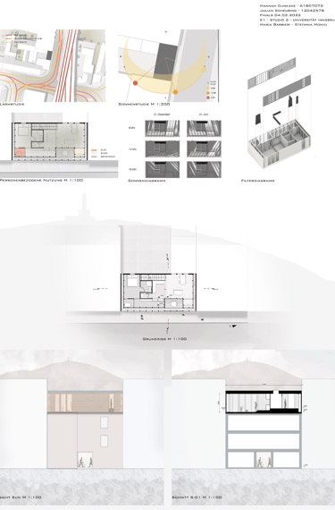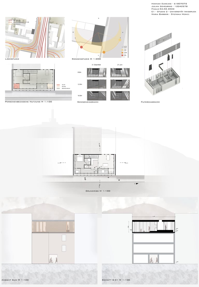 The result is a classic architectural project that includes all essential elements: site analysis, floor plans, sections, elevations, and conceptual development. The design responds directly to the constraints and opportunities of the chosen gap, transforming overlooked space into functional, livable urban housing.